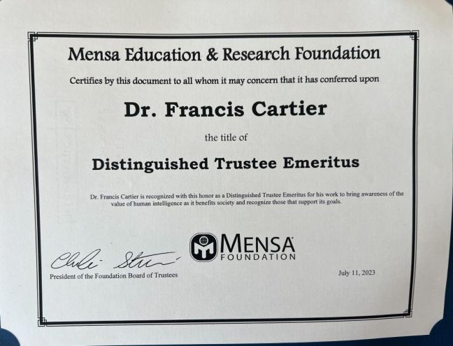 Fran has been a long-time member of Mensa (since first joining in 1970) and has garnered numerous awards since that time. In 2017 the Executive Committee of Monterey County Mensa donated $1000 to the Mensa Education and Research Foundation (MERF) scholarship fund in Fran’s honor. Founded in 1971, MERF is a philanthropic non-profit 501(c)3 organization committed to the pursuit of excellence in human intelligence. Fran joined the board of MERF in 1989, serving as its president from 1992-1995, and continued as trustee through 2010. He also served as Associate Editor of the Mensa Research Journal which highlights scholarly articles and recent research related to intelligence from a diverse selection of nationally and internationally esteemed authors. He had a regular column (Notes, Quotes and Anecdotes) in the Journal up into his nineties. Fran was the recipient of the American Mensa Margot Award in 2011. The award is bestowed “for the rendering of exceptional service to Mensa for a number of years.” In 2019 Fran received the American Mensa Distinguished Service Award given for outstanding service to American Mensa. Among his other awards and distinctions, Fran received the President’s Call to Service Lifetime Achievement Award, presented to individuals who have given a minimum of 4,000 volunteer service hours. He is one of only 11 members of Mensa to receive this award.